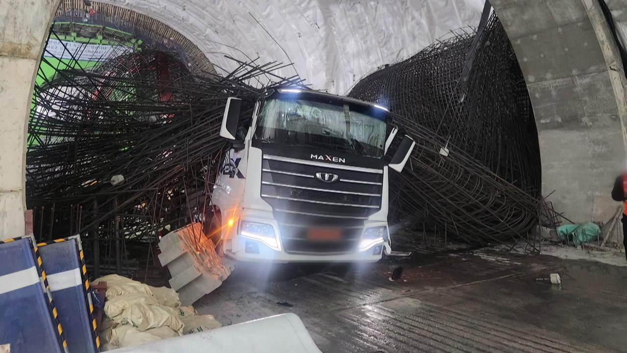 무너져내린 철근 구조물 밑에 파손된 작업 차량이 깔렸습니다.