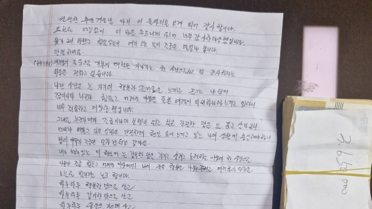 봉투에는 "자신보다 더 힘든 이웃을 위해 써 달라"는 짧은 메시지가 적혀 있었다고 한다. 군청 직원들이 뒤따라가 인적 사항을 요청했지만, 그는 "이름은 중요하지 않다"는 말만 남긴 채 끝내 신상을 공개하지 않았다.