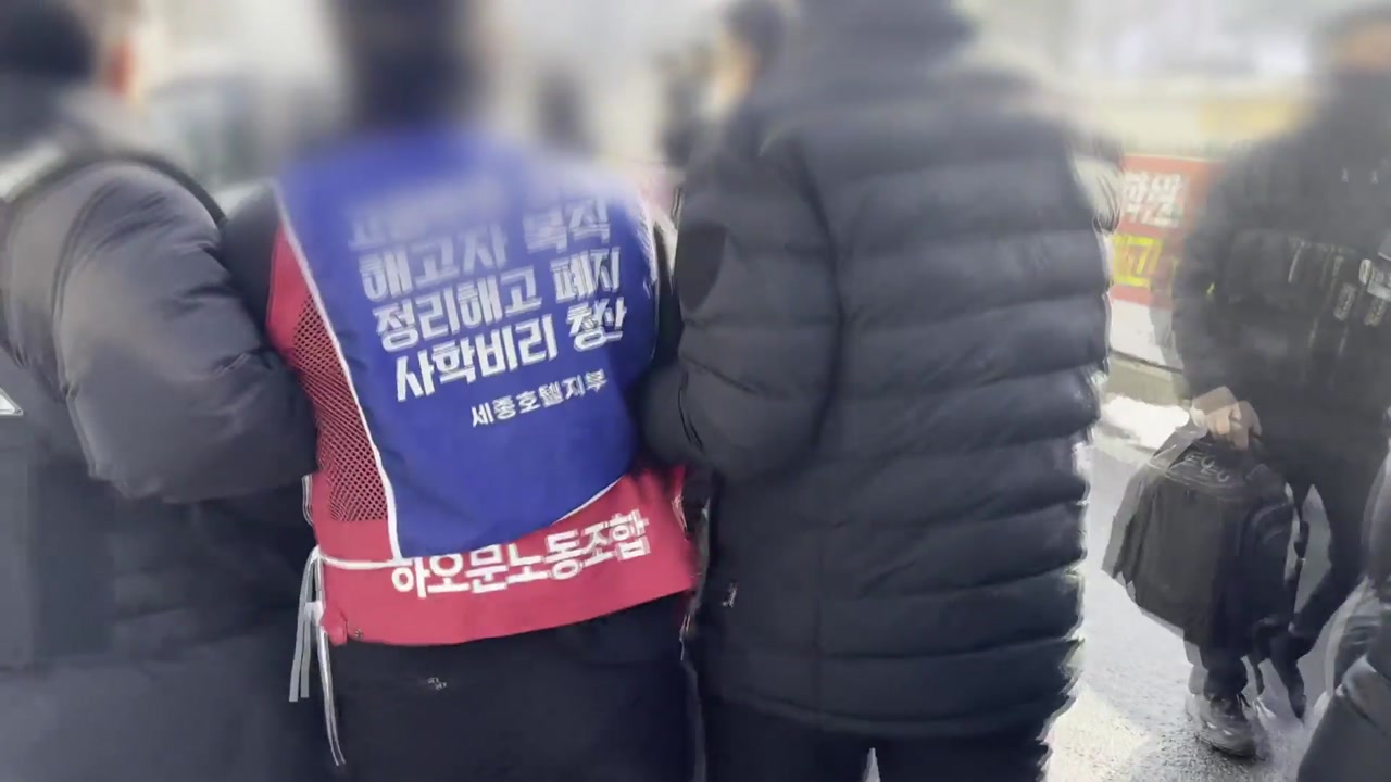 오늘(2일) 오전 서울 중구에 있는 세종호텔에서 복직을 요구하며 농성을 벌이던 노조 관계자 12명이 경찰에 강제 연행됐습니다.