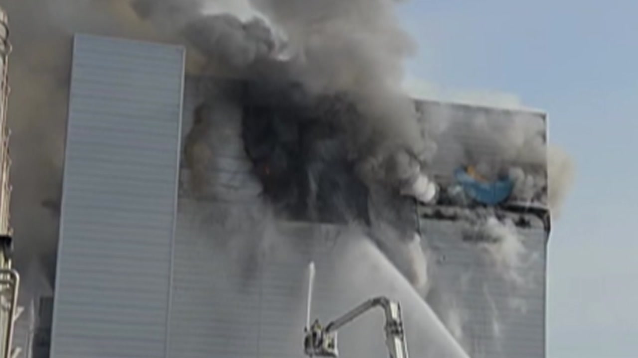 공장 건물 한가운데서, 검은 연기가 솟구쳐 올라옵니다.