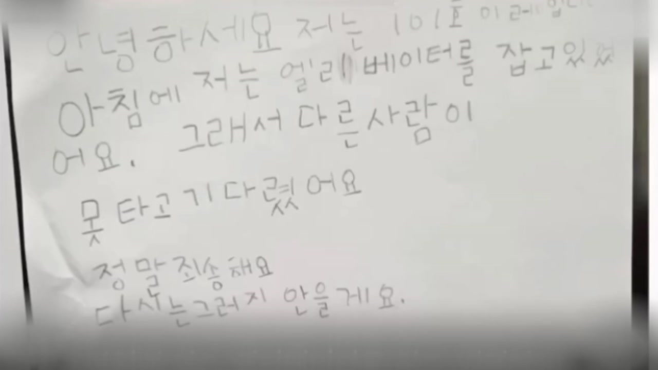 “아침에 엘리베이터를 잡아 다른 분들이 못 탔어요, 정말 죄송해요, 다시는 안 그럴게요”라고 쓰인, 아이의 삐뚤빼뚤한 글씨가 보이죠.