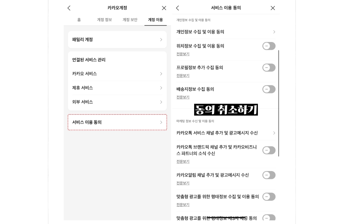 이에 따라 카카오의 서비스 관련 이용 동의를 해제해야 한다며, ▲위치 정보 수집·이용 동의 ▲프로필정보 추가 수집 동의 ▲배송지 정보 수집 동의 등을 필수적으로 해제하라는 경고가 이어지고 있다.