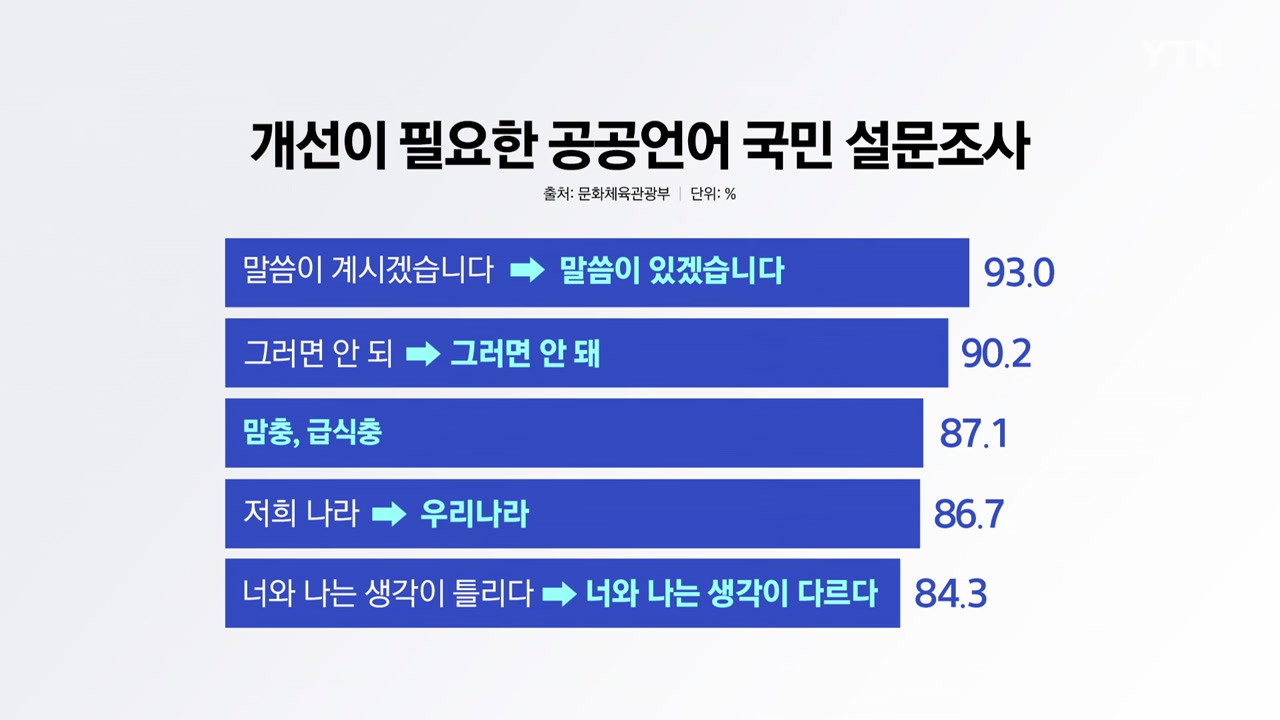 문화체육관광부와 국립국어원은 어제 '개선이 필요한 공공언어 국민 설문조사' 결과를 발표했습니다.