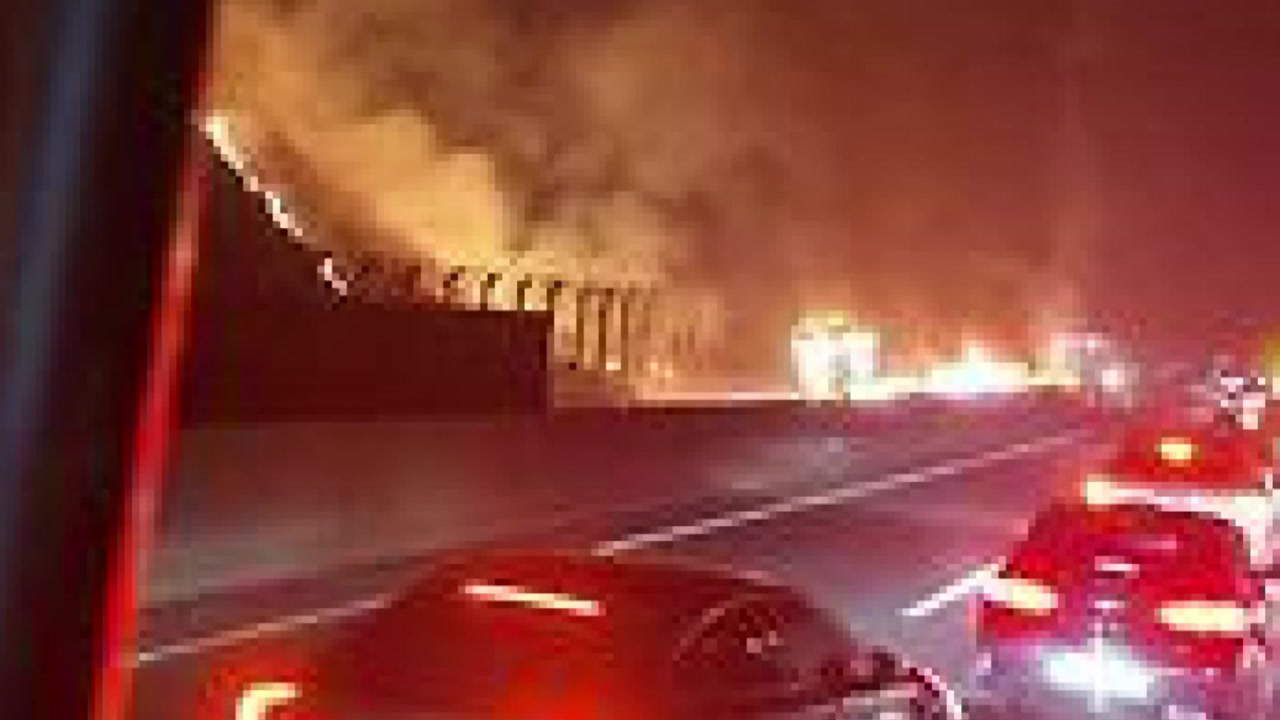 바로 아래 25톤 트레일러는 화염에 휩싸여 뼈대만 남았습니다.