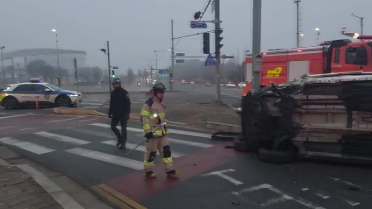 오늘(15일) 아침 7시 10분쯤에 인천 서구 연희동에 있는 아시아드 주경기장 근처 교차로에서 20대 남성 A 씨가 몰던 SUV가 우회전하다 교통섬에 있는 전신주를 들이받고 전도됐습니다.