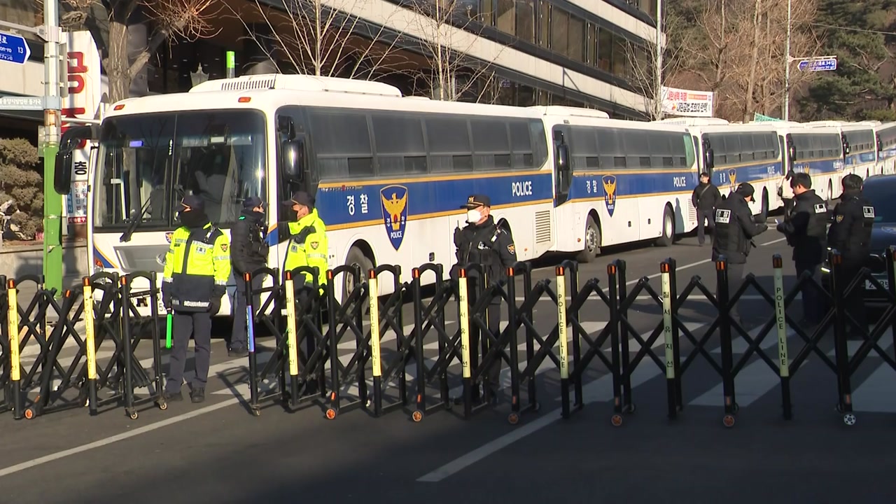 중앙지법 바로 앞인 법원로 인근에는 경찰 버스도 대열을 정비해 벽을 만들어 놓은 상태인데요, 윤 전 대통령 처벌 찬반 양측의 충돌 우려로 가운데 길목에 경찰 버스를 세워 벽을 만든 모습입니다.