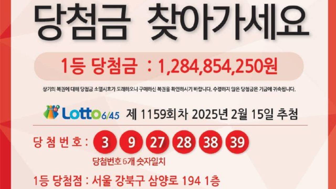 19일 파이낸셜뉴스는 복권수탁사업자 동행복권을 인용해, 1159회 로또 1등 당첨자 1명(수동)이 미수령 당첨금 12억 8,485만 원을 기한 막판에 찾아갔다고 보도했다.