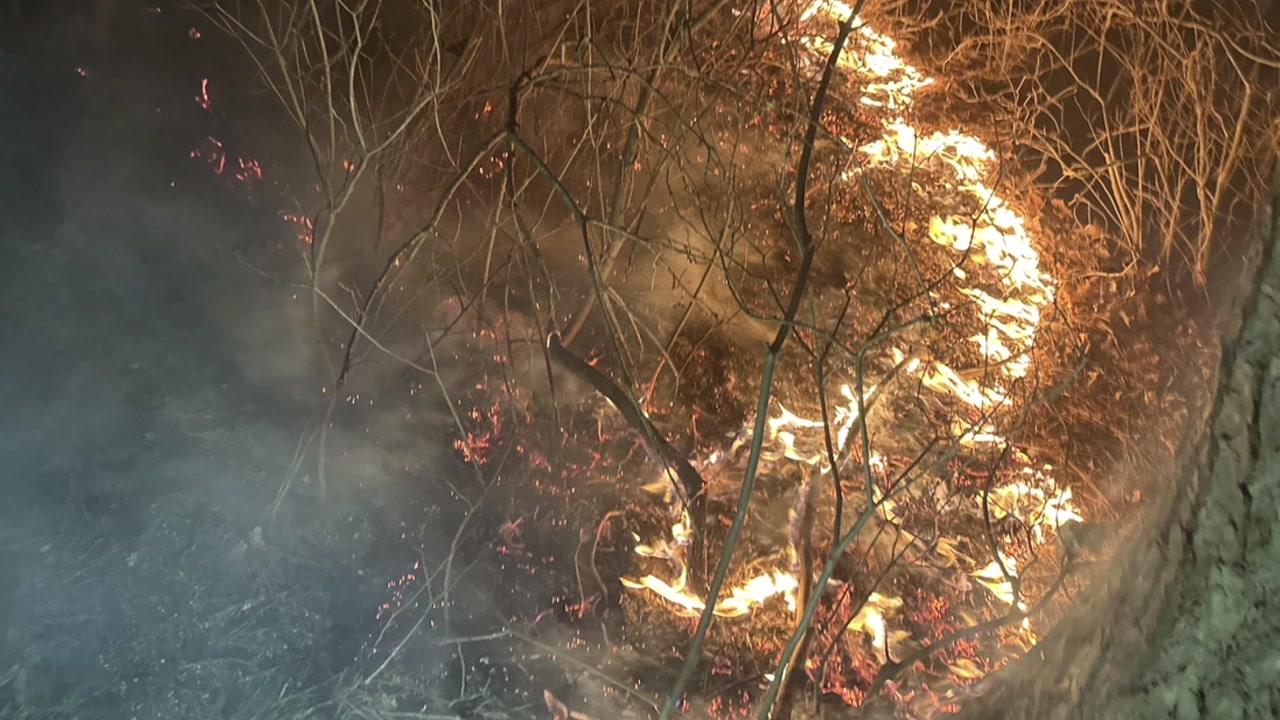 어둠이 자리 잡은 산등성 한가운데 새빨간 불길과 함께 희뿌연 연기가 솟아오릅니다.