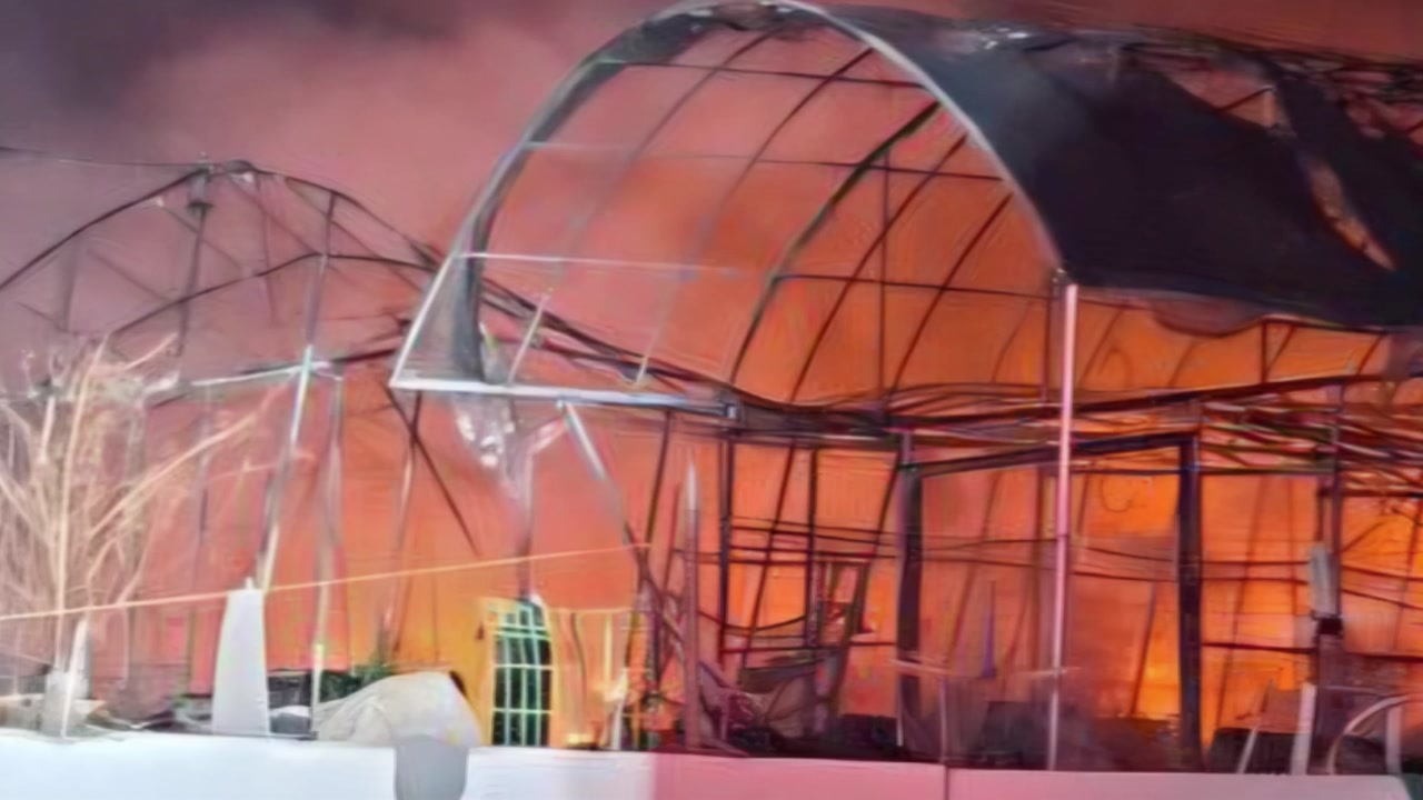 불에 탄 비닐하우스가 앙상한 뼈대를 드러냈습니다.