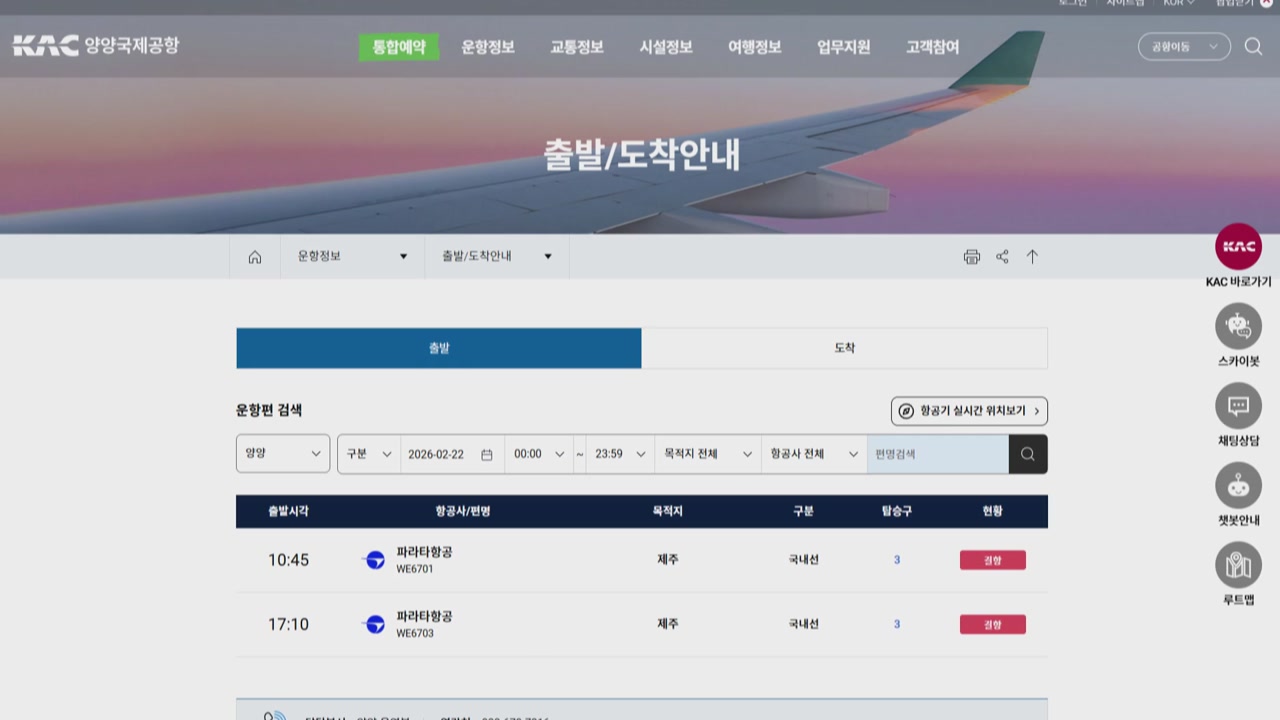 오늘(22일) 오전 8시 50분쯤 제주공항을 출발해 양양공항으로 향한 파라타항공 WE6712편이 강풍으로 인한 현지 기상 악화로 김포공항으로 회항했습니다.