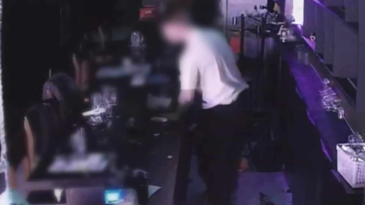 양주병을 계속 던져 부수면서, 카운터에 놓여 있는 기기를 내리쳐 파손하기도 합니다.