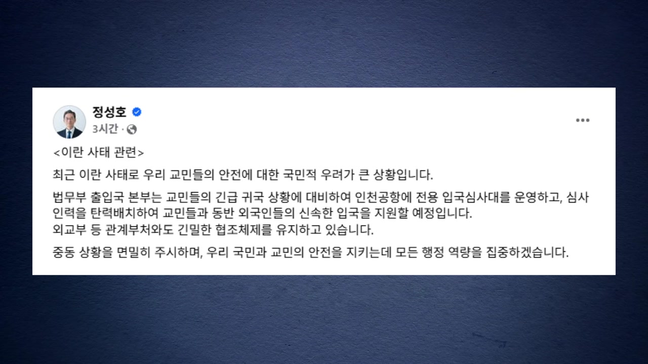 정 장관은 어제(1일) SNS에, 최근 이란 사태로 우리 교민 안전에 대한 국민적 우려가 큰 상황이라며 이같이 적었습니다.