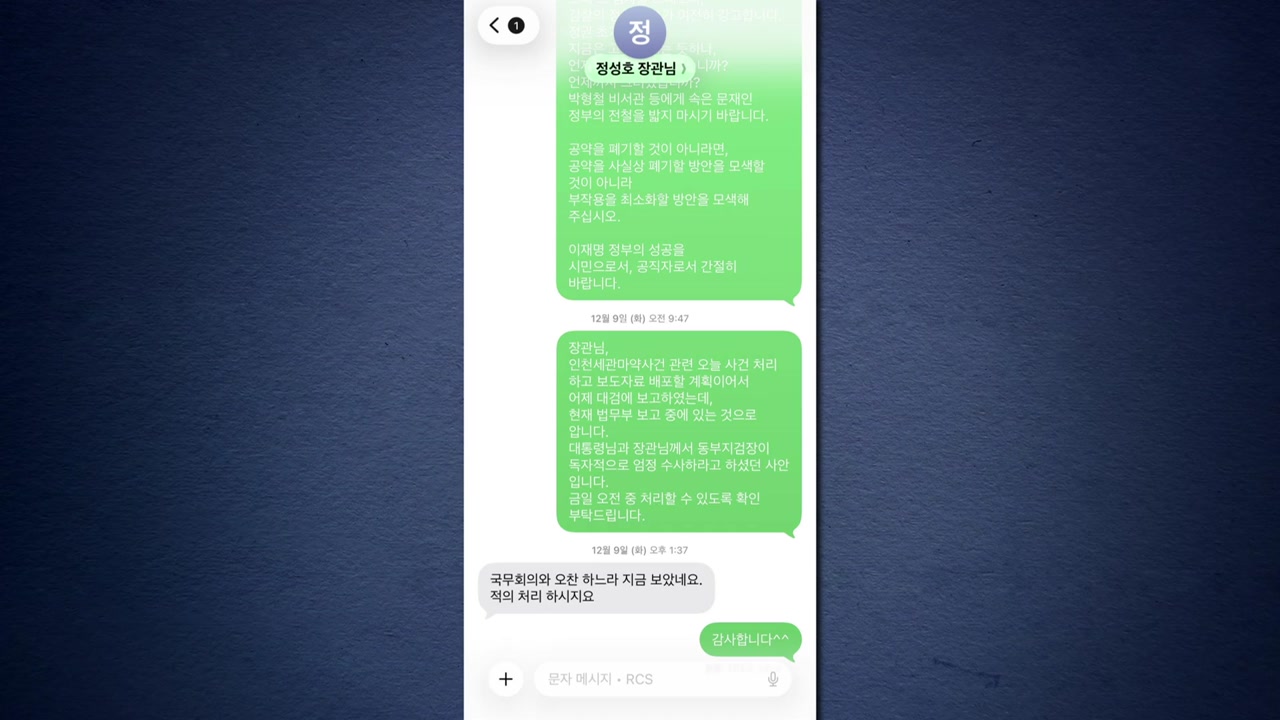 사진에는 임 검사장이 지난해 12월 9일, 인천세관 마약 사건 보도자료를 오전 중에 처리할 수 있도록 해달라고 요청하자, 정 장관이 적의 처리하라고 답하는 내용이 담겼습니다.