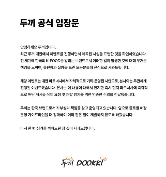 두끼 본사는 입장문을 통해 "불편함과 실망을 드린 모든 분께 사과드린다"며 고개를 숙였다. 다만 "해당 이벤트는타이완 파트너사가 자체적으로 기획·운영한 사안으로 본사와는 무관하다"며 선을 그었다. 이어 "문제가 된 게시물의 삭제를 요청했으며 재발 방지를 위해 엄중한 주의를 전달했다"고 밝혔다. 현재 게시물은 삭제된 상태다.
