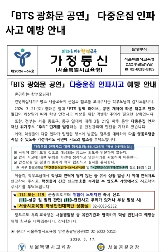 19일 교육계에 따르면 서울시교육청은 초·중·고에 '다중운집 인파 사고 예방 안내' 가정통신문을 배포했다. 공연 당일 대규모 인파가 예상되면서 혼잡 지역 방문 자제, 안전거리 확보, 위급 시 112·119 신고 등 행동 요령을 안내했다. 특히 21일에는 종로·중구 일대에 재난 위기경보 ‘주의’ 단계가 적용되는 만큼 가정에서도 사전 지도를 당부했다.