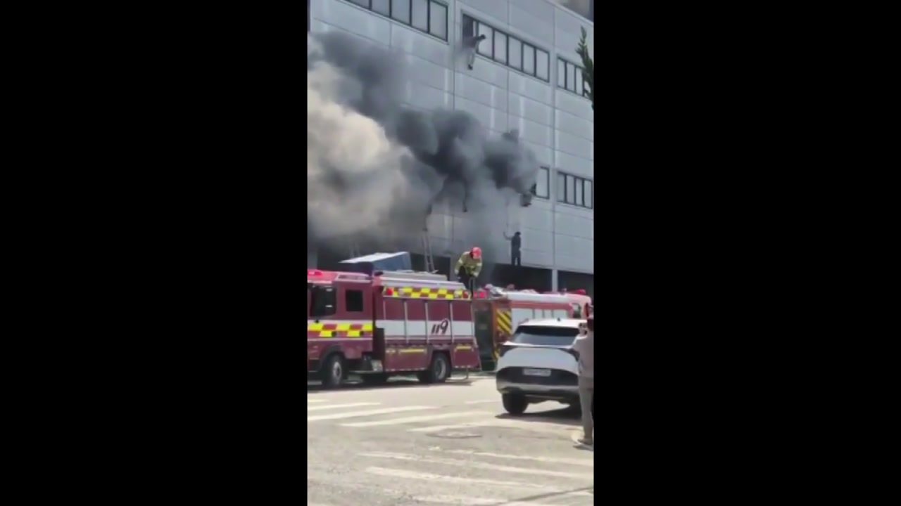 건물 밖으로 검은 연기가 밖으로 뿜어져 나오고.