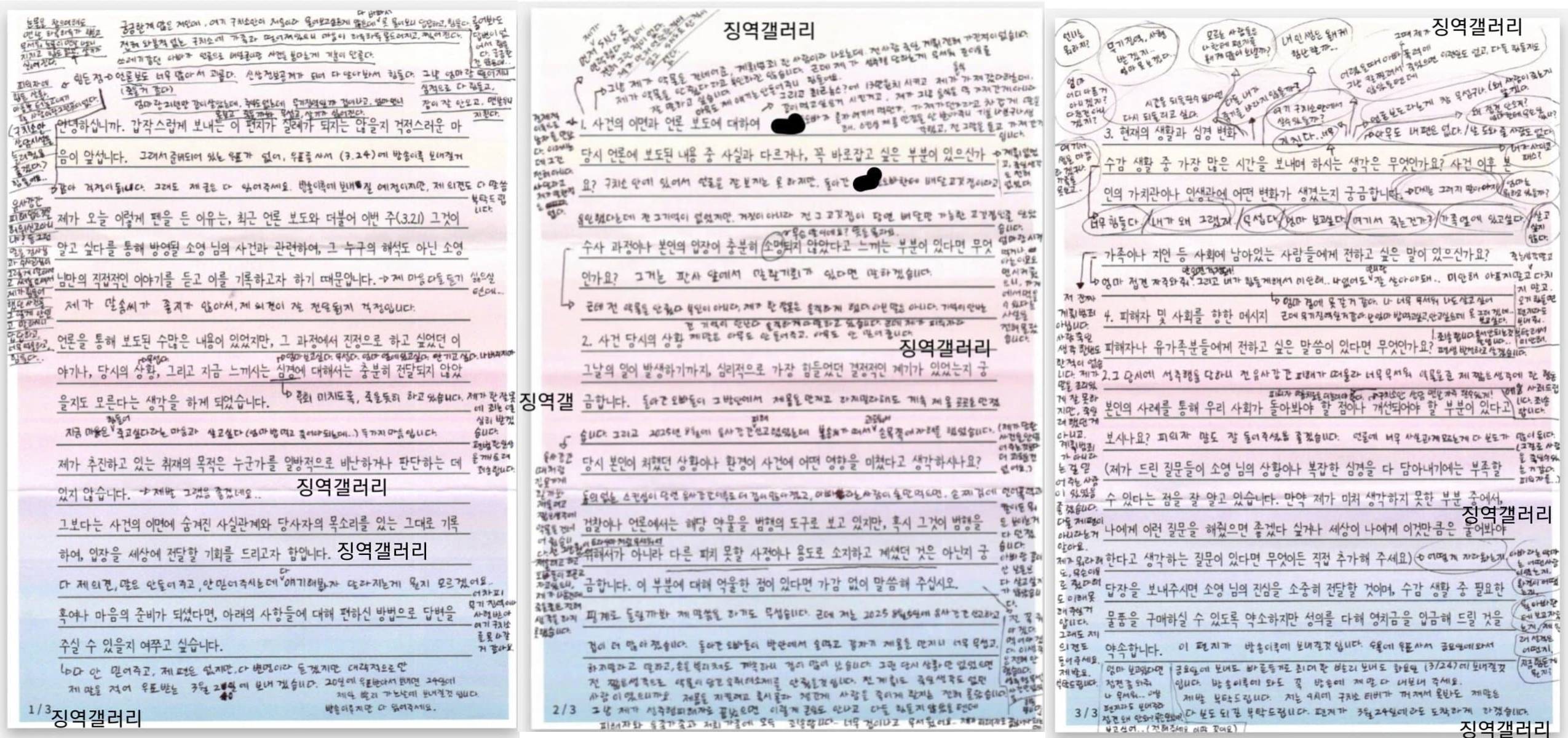지난 24일 한 온라인 커뮤니티에는 서울구치소에 수감 중인 김소영에게 편지를 보내 답장을 받았다는 글과 함께 5장 분량의 자필 편지 사진이 게시됐다. 작성자는 사건 당시 상황과 현재 심경 등을 묻는 질문을 보냈고, 김소영이 이에 답하는 형식으로 편지가 구성됐다.