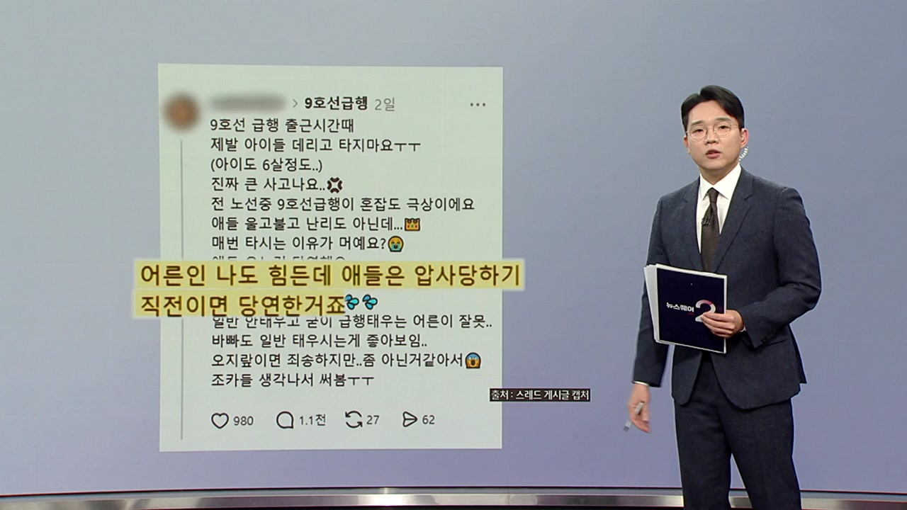 한 누리꾼이 자신의 SNS에 올린 글을 보고 계신데요, 출근 시간대에 혼잡도가 심한 9호선 급행열차를 언급하며, 이 열차에 아이를 데리고 타는 시민을 지적합니다.