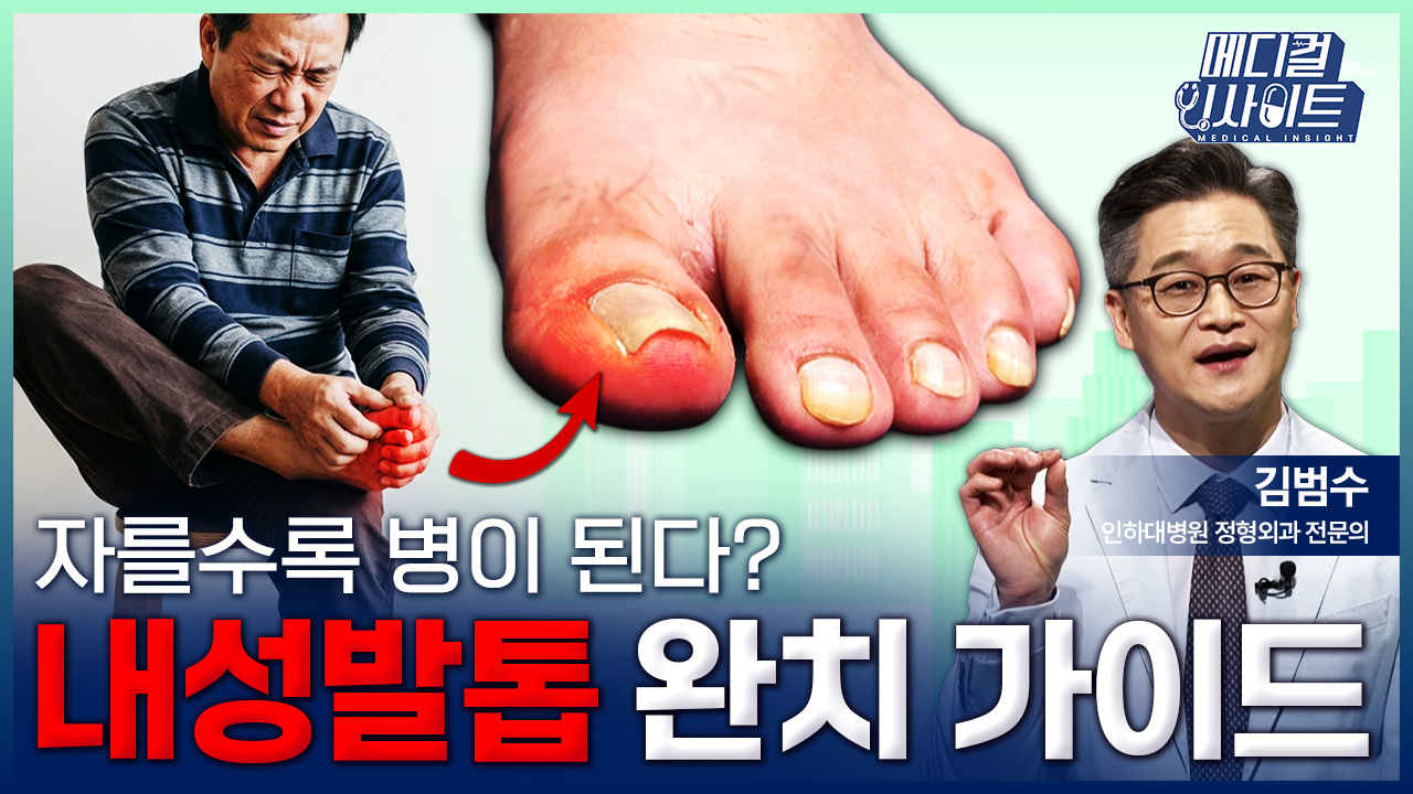 ◆김범수: 자, 그럼 내성 발톱에 대해 본격적으로 한번 알아볼까요? 먼저 내성 발톱은 그 이름에서 오는 오해가 있는데요. 우리말로는 내성 또는 내향성 발톱이라고 해서 발톱이 안을 향하고 있다라는 의미를 갖고 있죠. 바로 이 이름 때문에 많은 분들이 발톱이 안으로 자라 들어가서 살을 뚫는 병이라고 생각하시는데요. 실제로는 발톱이 송곳처럼 살을 뚫거나 살속을 파고들어가서 자란다기보다는 발톱 옆살이 염증으로 퉁퉁 붓거나 육아 조직이라고 하는 새살이 발톱 위로 덮듯이 이렇게 자라나기 때문에 마치 발톱이 살 속을 파고든 것처럼 보이는 겁니다. 내성 발톱의 본질은 딱딱한 발톱의 모서리와 부드러운 옆살이 계속 부딪히면서 눌리고 상처와 염증이 반복되는 병인 거죠. 너무 꽉 끼는 신발을 신거나 많이 걸으면 신발 속에서 발가락들끼리 서로 밀착되고 발톱 모서리가 옆살을 압박하게 되는데요. 그런 자극이 누적되다 보면 어느 순간 미세한 상처가 나고 염증이 생기면서 살이 붓게 되는 거죠. 그러다가 그 상처를 통해 세균 감염이 되면 염증이 심해져서 더 붓고 발적과 열감이 심해지다가 결국 고름이 나오는 상태가 됩니다. 이런 염증 상태가 오랫동안 지속되고 반복되다 보면 염증에 의해 새 살 같은 조직이 만들어지는데요. 이를 육아 조직이라고 합니다. 이 육아 조직은 마치 암덩이처럼 계속 자라나서 발톱 옆을 덮어버리기도 하는데요. 저런 상태가 되니까 마치 발톱이 살 속으로 파고든 것처럼 보이기도 하는 겁니다. 내성 발톱은 한 번 생기면 그냥 둬서는 저절로는 잘 낫지 않아서 오랫동안 고생하는 경우가 많은데요. 염증과 상처 붓기와 감염의 이 악순환이 반복되기 때문입니다.