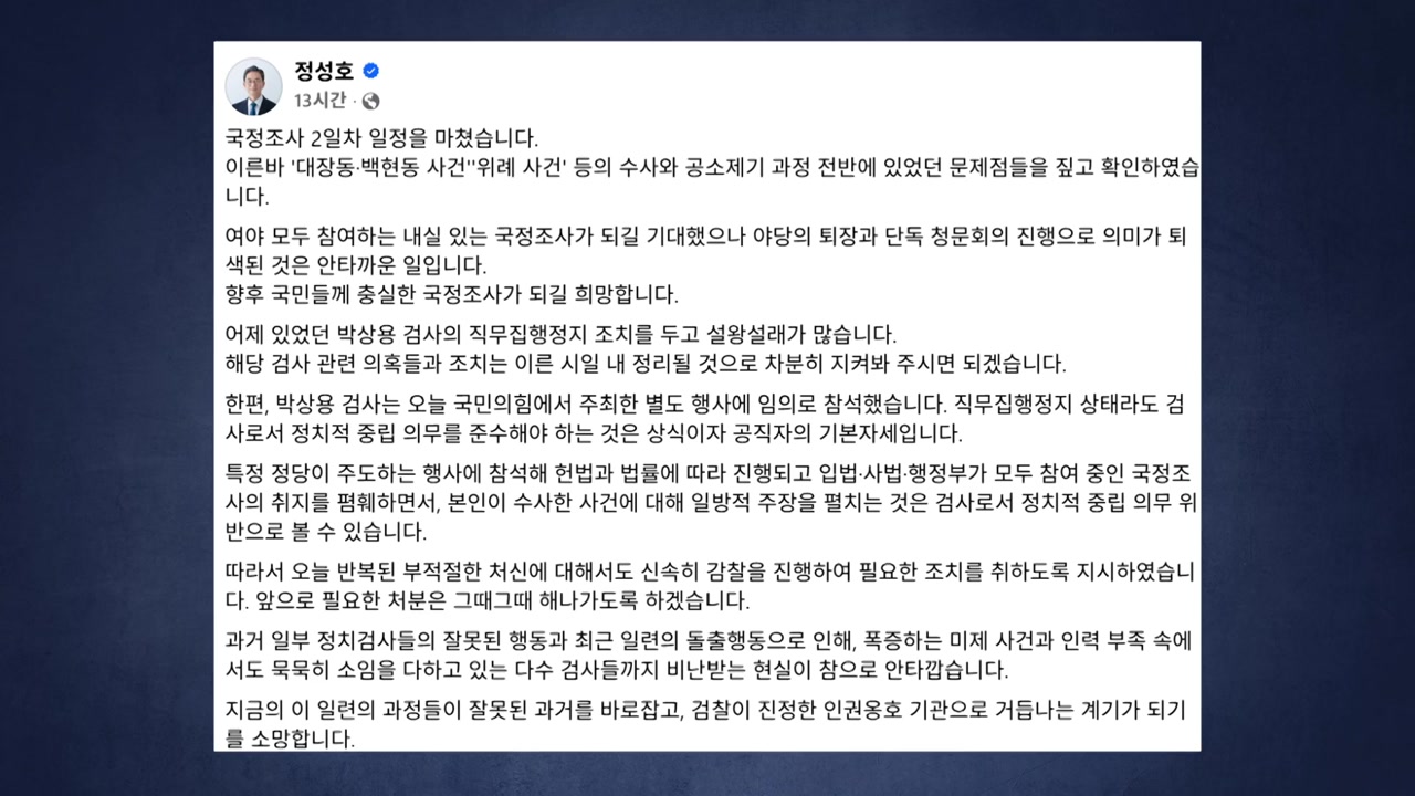 정 장관은 자신의 SNS에, 특정 정당이 주도하는 행사에 참석해 국정조사 취지를 폄훼하고 본인이 수사한 사건에 대한 일방적 주장을 펴는 건 검사의 정치적 중립 의무 위반으로 볼 수 있다며 이같이 적었습니다.