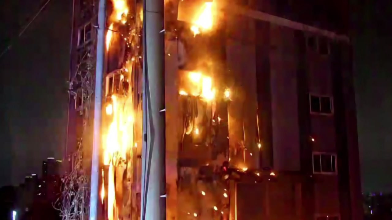 고속도로 옆에 서 있는 건물이 새빨갛게 타오르고, 불티가 주위로 떨어져 내립니다.