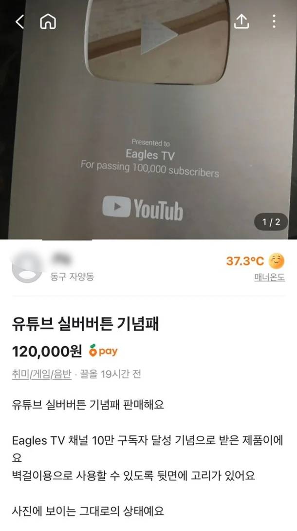 게시자는 '이글스TV 채널 10만 구독자 달성 기념으로 받은 실버버튼'이라며 판매를 시도했다. 가격은 12만 원에서 15만 원으로 인상된 뒤 '예약 중' 상태로 바뀌었다고 알려졌다.