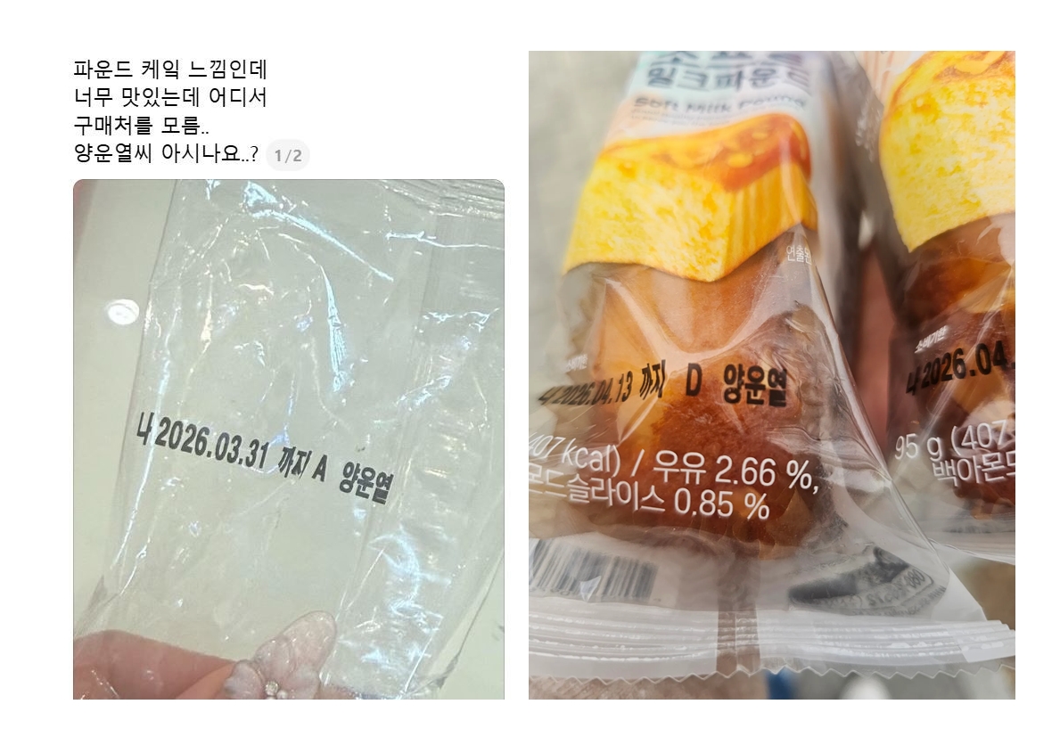 최근 소셜미디어(SNS)에서는 한 누리꾼이 "너무 맛있는 파운드케이크를 찾았는데 구매처를 모르겠다, 양운열 씨를 아느냐"라는 글과 함께 빵 포장지를 촬영한 사진을 공유했다.