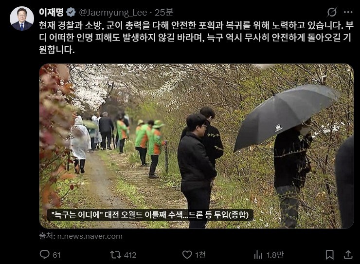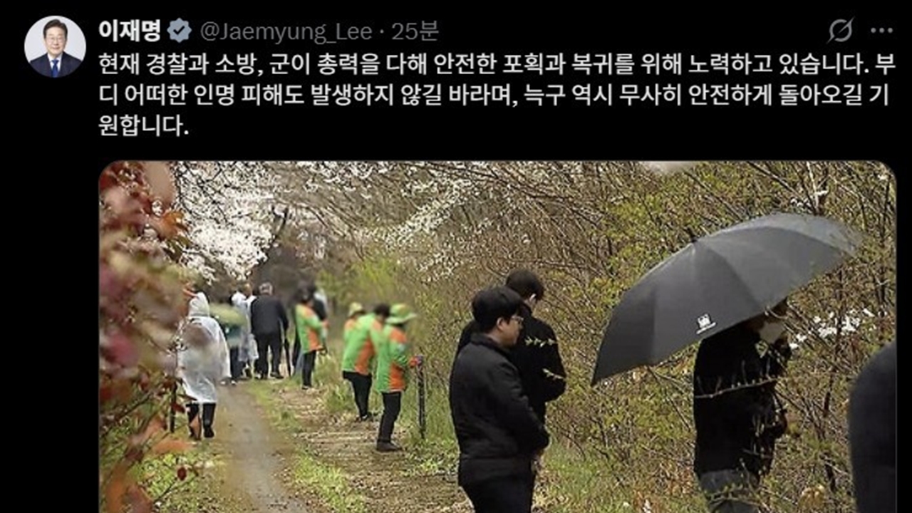 이날 이 대통령은 엑스(X·옛 트위터)에 늑구의 수색 상황을 담은 기사를 공유하며 이같이 적었다.