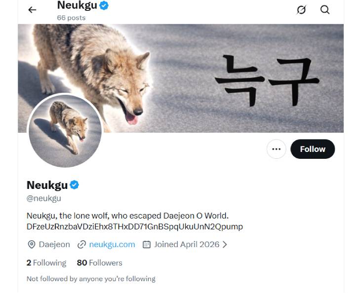 게시물에는 "늑구는 외롭지만 독립적이다", "석양 속으로 떠나고 있어. 절대 나를 찾을 수 없어", "찾을 수 있다면 찾아봐" 등 늑구를 응원하는 글이 이어지고 있다. 다만 해당 계정에는 코인을 홍보하는 게시물도 함께 올라오고 있어 투자 주의가 필요하다는 지적도 나온다.