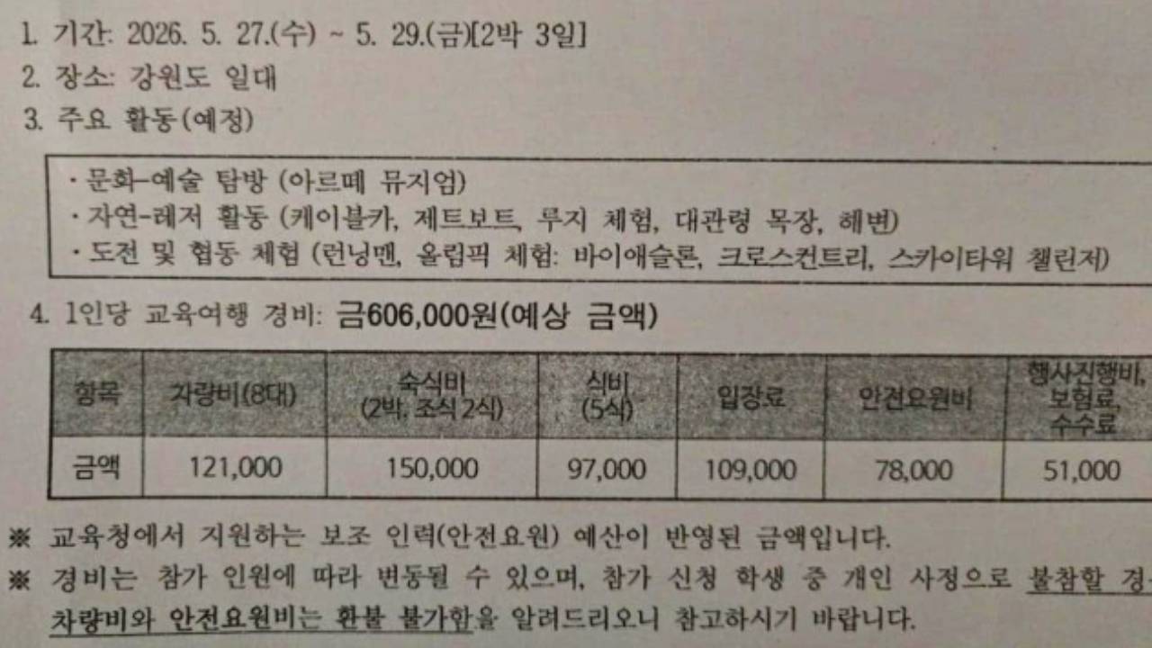 최근 온라인 커뮤니티에는 강원도 일대 2박 3일 일정의 중학교 수학여행 비용이 60만 6,000원이라는 안내문이 공유되며 논란이 불거졌다. 해당 비용을 본 일부 학부모와 학생들은 "지나치게 비싼 것 아니냐"며 불만을 제기했고, 일부 학생은 비용 부담을 이유로 불참 의사를 밝히기도 했다.