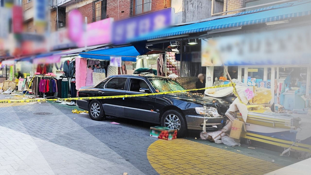 시장 골목으로 승용차 한 대가 돌진하더니 가판대를 휩쓸고 나서야 멈춰 섭니다.
