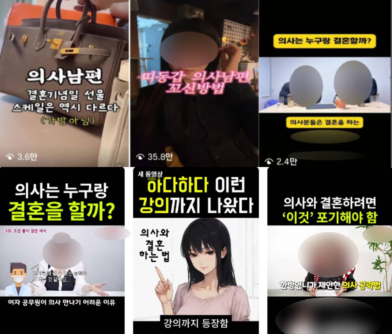 17일 인스타그램과 유튜브 등에 '의사 남편', '의사 와이프'를 검색하면 '의사는 누구랑 결혼을 할까?', '의사 남편과 결혼한 비결', '연봉 25억 의사 남편의 일상' 등 자극적인 제목의 숏폼 영상이 다수 올라와 있다. 일부 영상은 명품 쇼핑, 고급 호텔, 한강뷰 아파트 등 소비 중심의 생활상을 강조하며 수백만 회가 넘는 조회수를 기록하기도 했다.