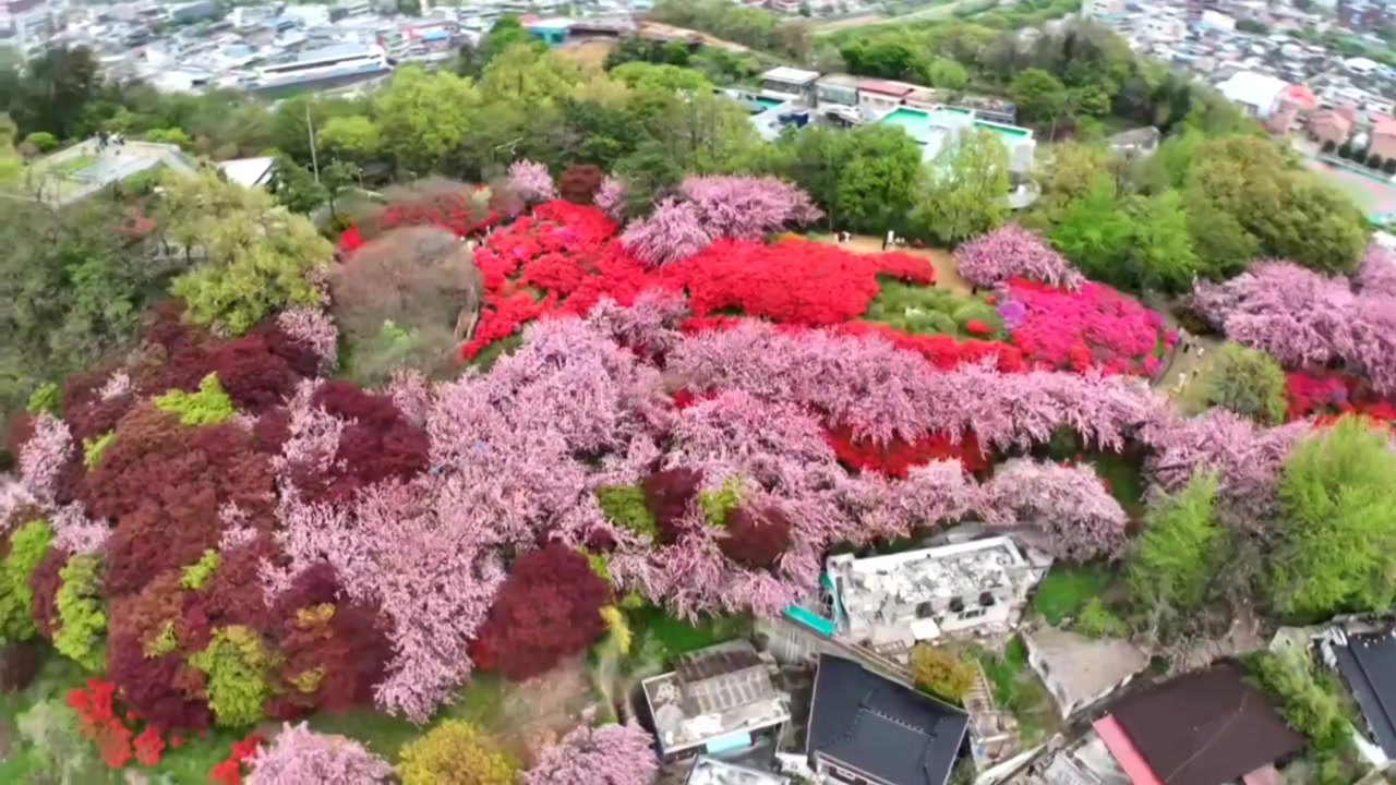 전망대에서 바라보면 분홍빛의 겹벚꽃과 붉은 철쭉이 동시에 만개해 꽃물결을 이루고 있는데요.