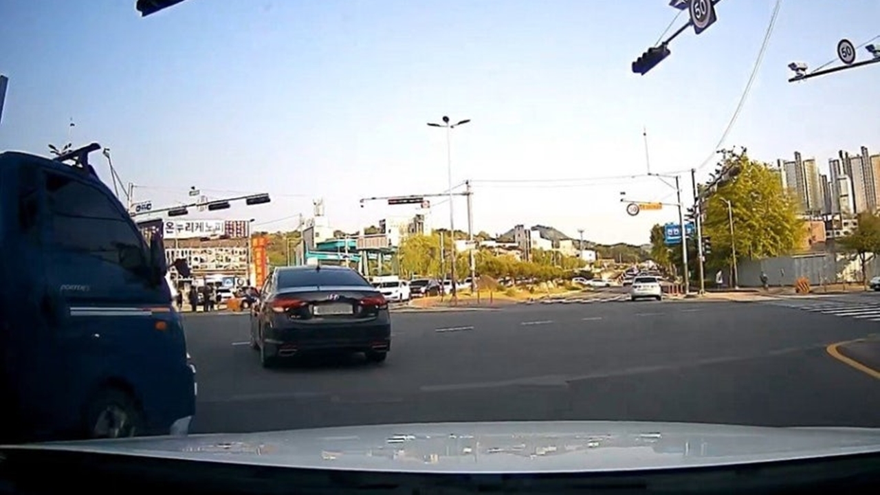 좌회전 차로에서 직진하는 차량에 고의로 사고낸 A씨 차량 블랙박스 영상=충남경찰청 제공