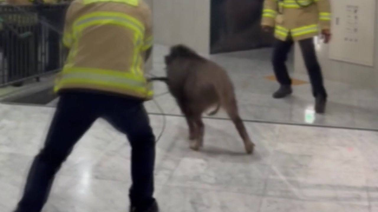 다른 소방대원은 올가미를 걸어보려다 돌진하는 멧돼지를 간신히 피합니다.