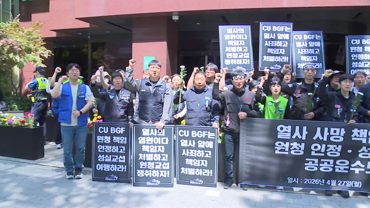 공공운수노조는 오늘(27일) 오전 서울 삼성동 BGF 리테일 본사 앞에서 기자회견을 열고, 이번 노동자 사망은 실질 지배력을 행사하는 원청이 계약 구조를 이유로 교섭 책임을 부정해온 결과라며, 사고 책임을 인정하고 사과하라고 요구했습니다.