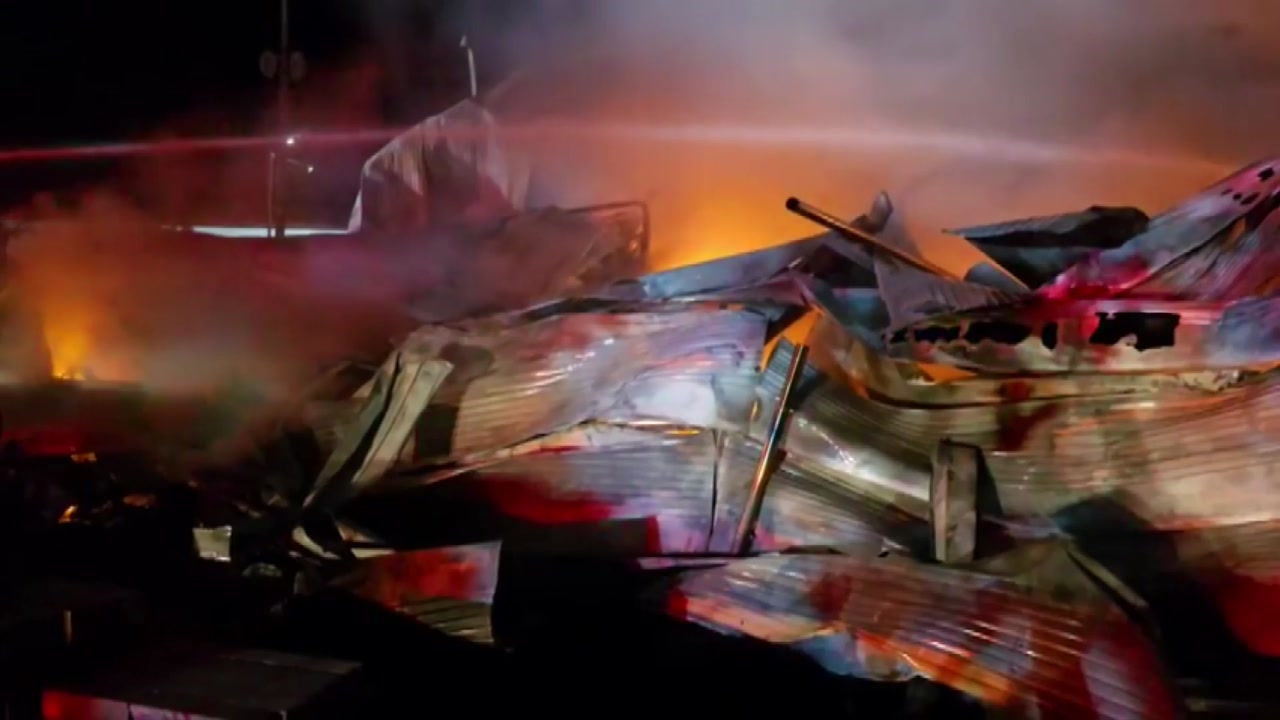 형체만 남은 창고 안에서 시뻘건 불길이 타오르고, 희뿌연 연기가 밤하늘로 솟구칩니다.