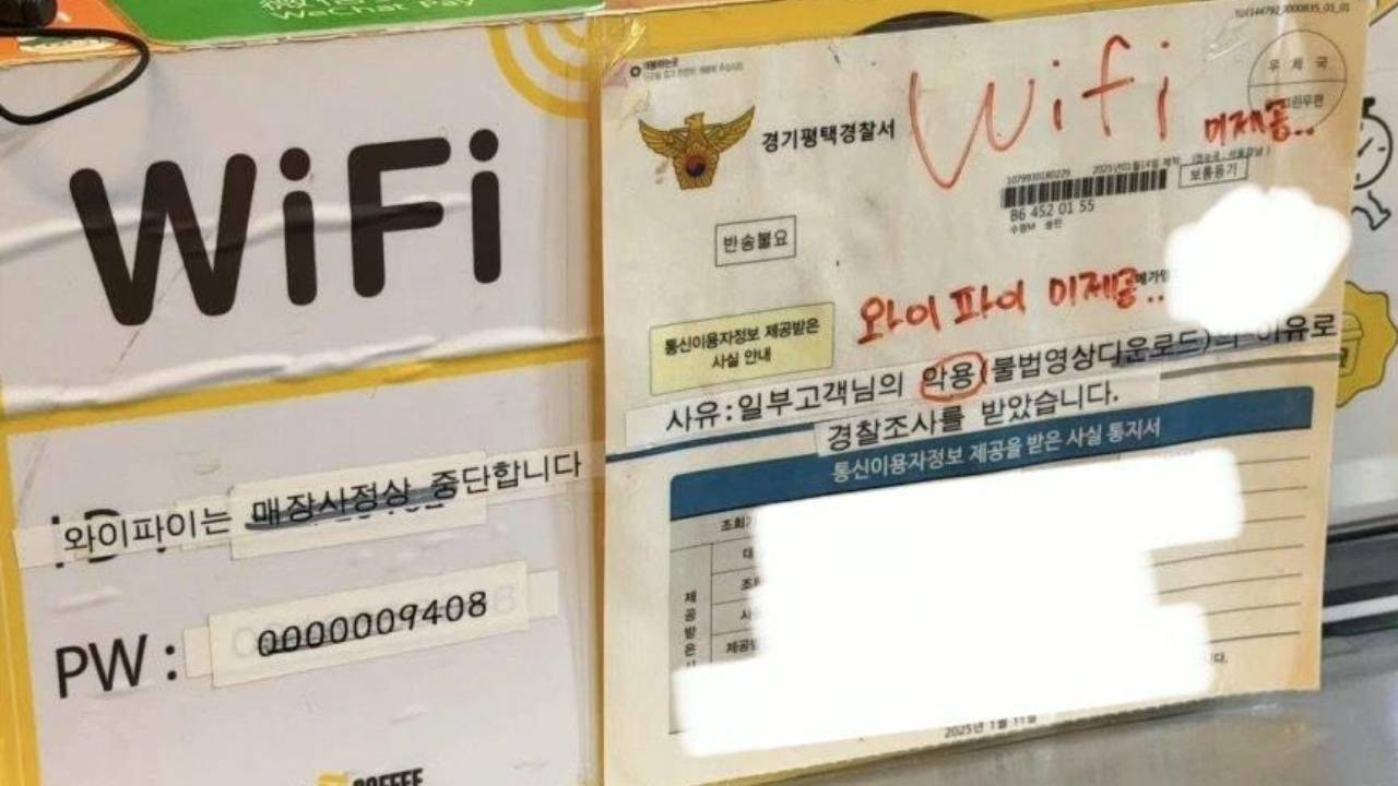 점주는 안내문을 통해 "일부 고객님의 악용(불법 영상 다운로드)의 이유로 경찰 조사를 받았다"며 와이파이 제공 중단 이유를 설명했다. 일부 문구에는 빨간색 표시를 해 고객들의 눈에 띄도록 강조한 모습도 담겼다.