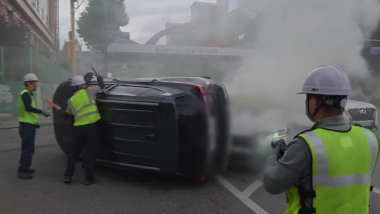 넘어진 차량 사이로 희뿌연 연기가 피어오르고, 구청 관계자들이 다급히 망치로 유리창을 깹니다.