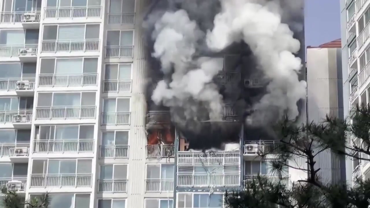 아파트에서 시뻘건 불길이 타오르고 연기가 뿜어져 나옵니다.
