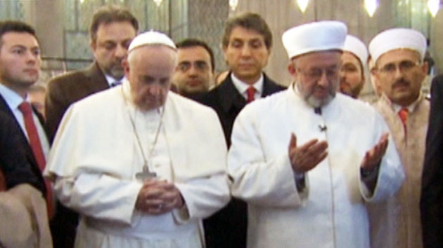 교황은 이슬람 지도자와 함께 잠시 멈춰서서 경의를 표합니다.