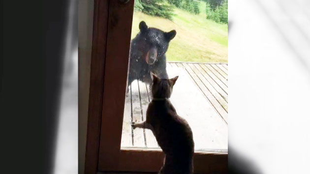 문을 사이에 두고 대치중인 곰과 고양이.