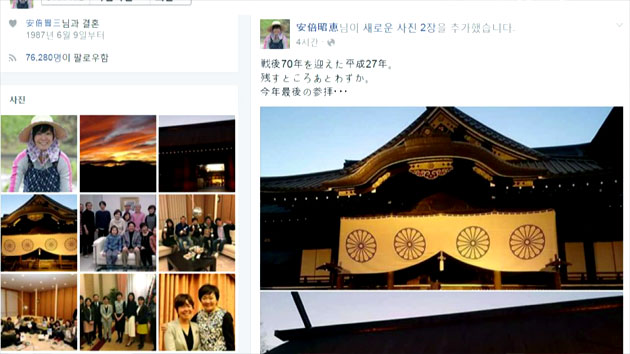 아키에 여사는 자신의 페이스북 계정에 참배 사실을 공개하고, 전후 70년을 맞이한 2015년이 얼마 남지 않았다며 '올해 마지막 참배'라는 글과 사진을 올렸습니다.