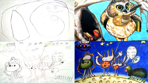 무엇을 그린 건지 알 수 없이 비뚤비뚤한 선으로 가득한 낙서들을 모아서 색을 입혀 넣고, 상상력에 숨을 불어 넣었더니, 이렇게 명화로 탈바꿈된 겁니다.