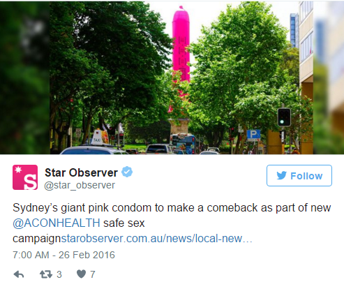 18미터 높이의 탑은 지난 금요일, '뉴 사우스 웨일즈' 건강증진 단체가 설치한 것입니다. 단체는 "안전한 성관계로 에이즈를 예방하자는 취지를 전달하기 위한 것"이라고 밝혔습니다.