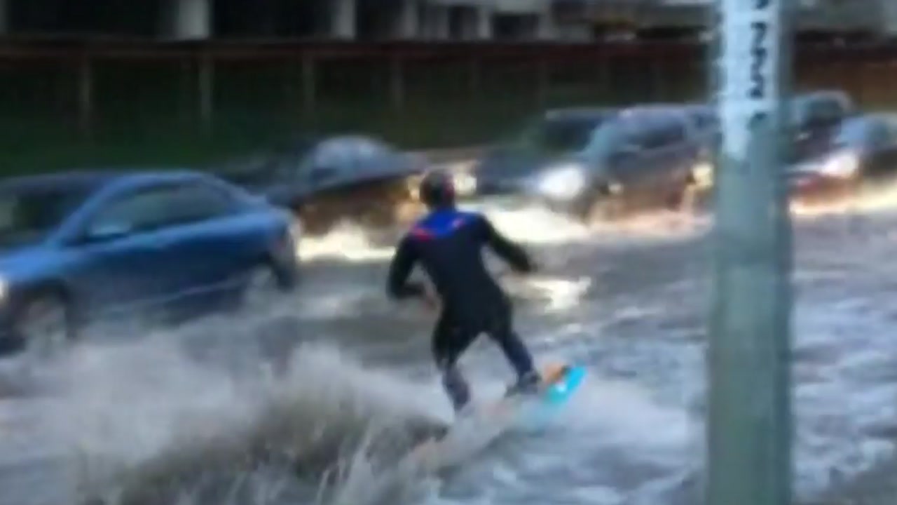 출렁이는 도로 위 물살을 타고 점프에 회전까지 갖가지 묘기도 뽐냅니다.