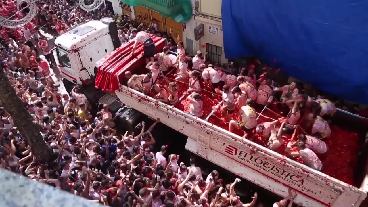 트럭이 들어서며 '토마토 전쟁'의 막이 올랐습니다.