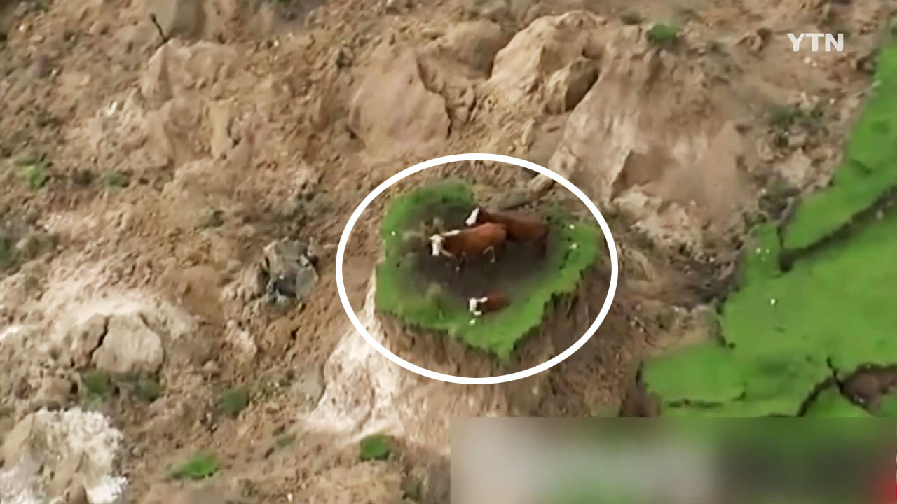 폐허 한가운데에 남아 있는 작은 땅뙈기 위에 소 세 마리가 오도 가도 못하고 있는데요.