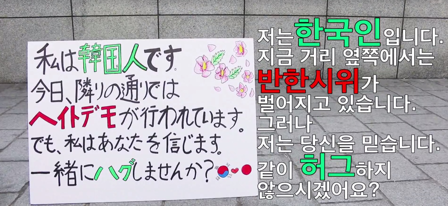 오사카의 한 거리 위 안대를 한 한국인이 서 있습니다. 옆에 놓인 팻말에는 이렇게 쓰여 있습니다. '저는 한국인입니다. 서로를 안아주실래요?'
