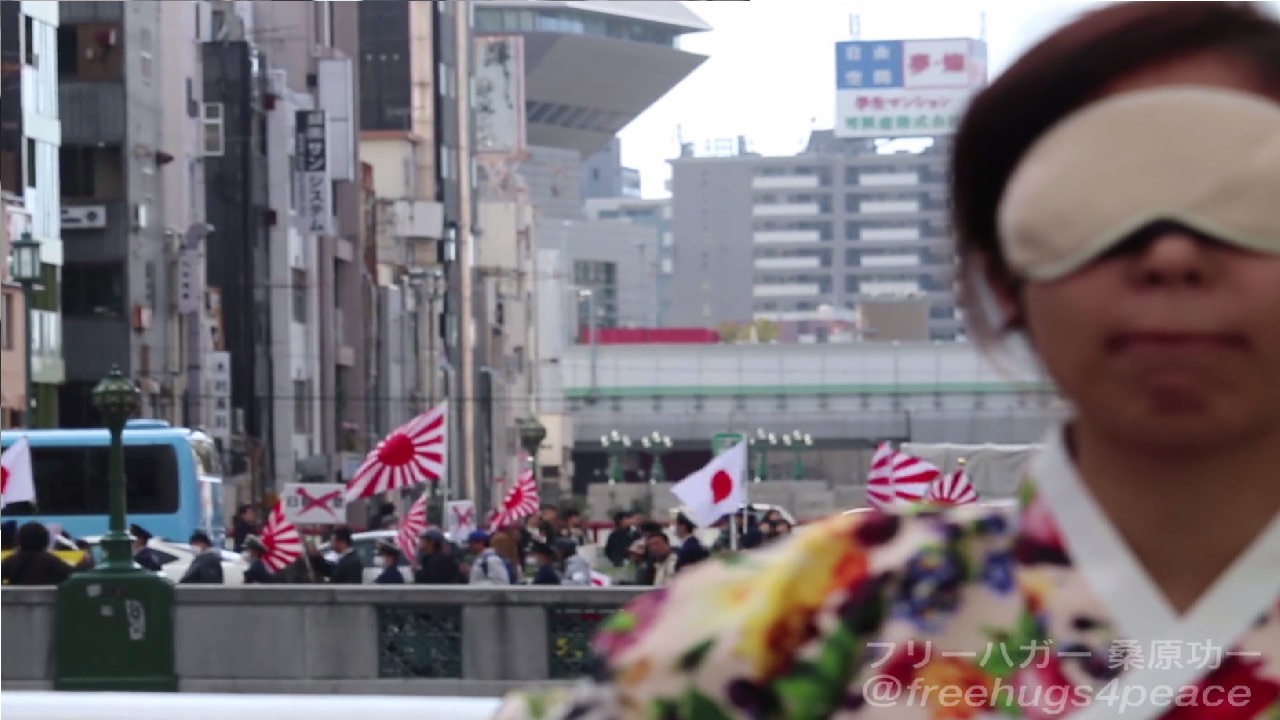 지난 21일 오사카에선 반한시위가 열렸습니다. 시위대는 일장기와 욱일기를 든 채 거리행진을 하고 있었습니다. 하지만 한 한국인 여성은 그 근처에서 안대로 눈을 가린 채 프리허그를 시작했습니다. 그의 옆에는 '옆 거리에서 반한시위를 하고 있습니다. 하지만 저는 당신을 믿습니다'라는 팻말이 놓여있었습니다.